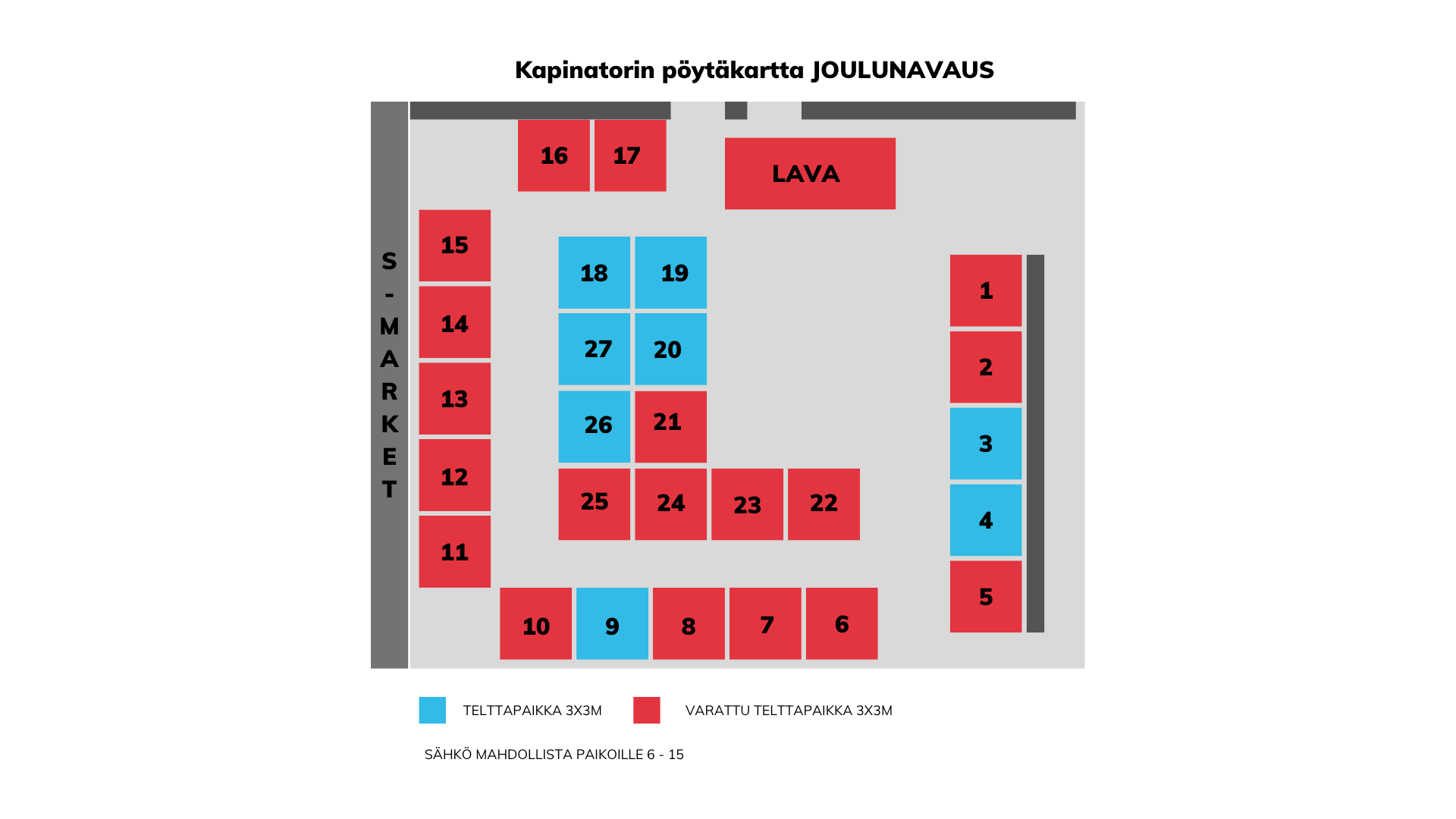 Pöytäpaikat 1-25. Sähköä on saatavilla S-marketin seinustan läheltä sähkökeskuksesta. Suositeltavaa ottaa omat, ulkokäyttöön tarkoitetut jatkojohdot mukaan. Mainitsethan mahdollisesta sähkön tarpeesta paikkaa varattaessa. Otathan myyntipisteellesi/telttaasi myös riittävästi valoja. Max 3x3m teltta + riittävät painot ja kiinnitys. Telttaohjeet tästä.