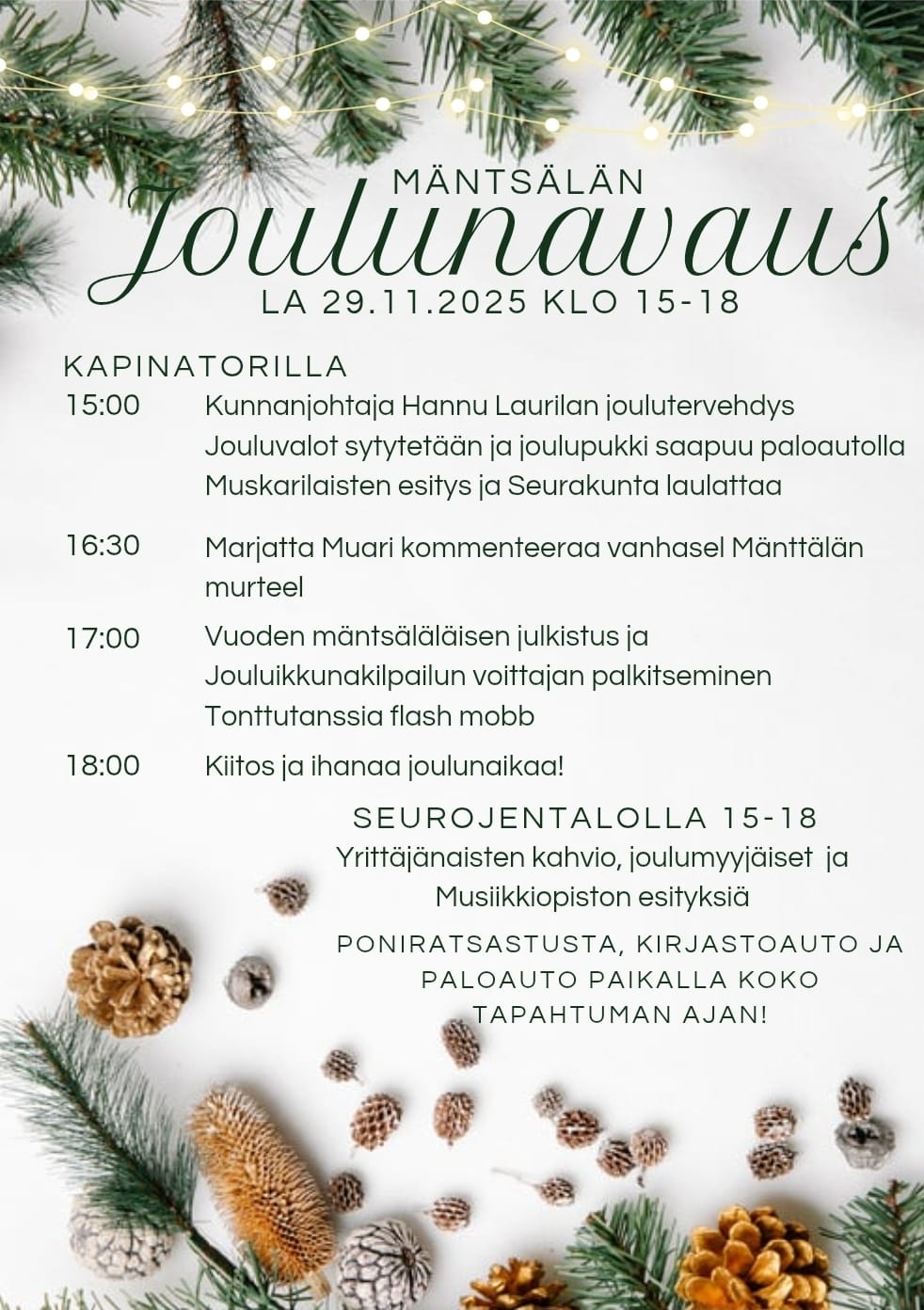 Myyntipöytiä ja ohjelmaa mm Joulupukki vierailee, yhteislaulua, Mänttälän murretta, vuoden 2025 mäntsäläläisen palkitseminen sekä Jouluikkunakilpailun voittajan palkitseminen.